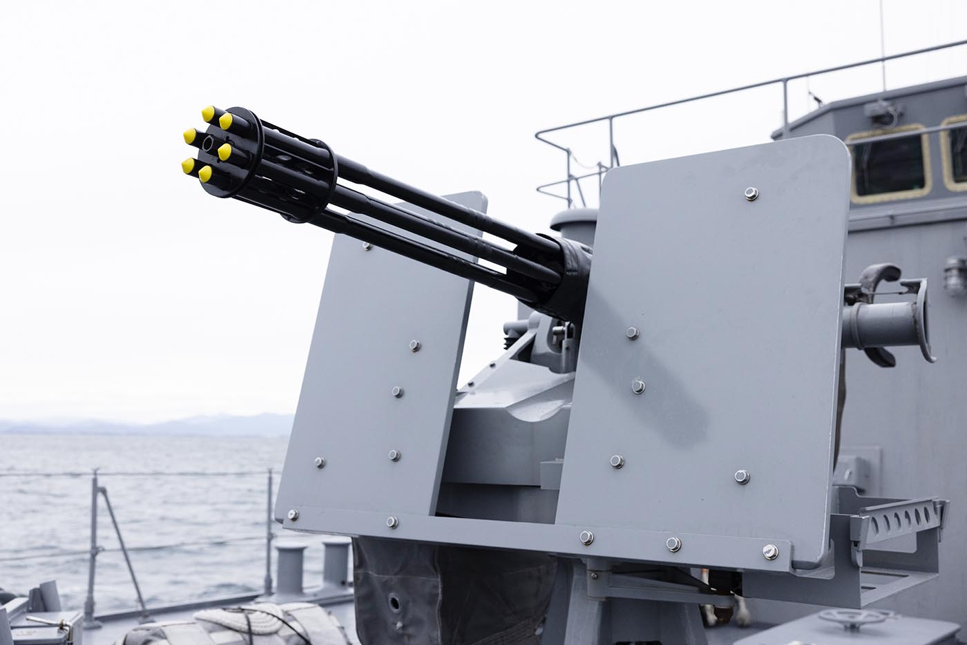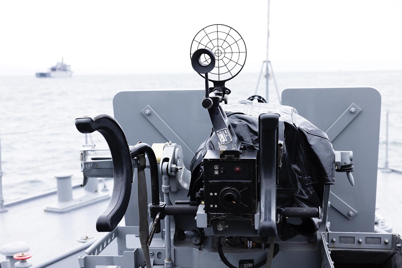 係留ワイヤを切ると機雷が浮上してくるので、それを上の写真の機関砲で撃つ。この機関砲は、航空機用のものを転用したものだけど、発射速度を遅くしてある。発射速度が速いと命中精度がよくないのだ。人力で動かして照準を合わせるからね。