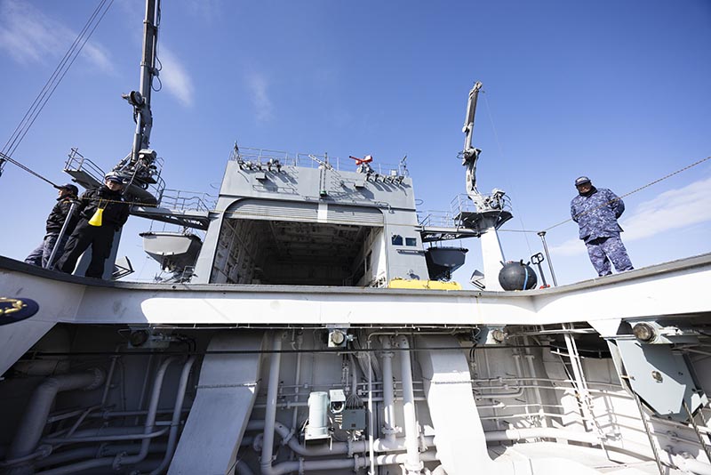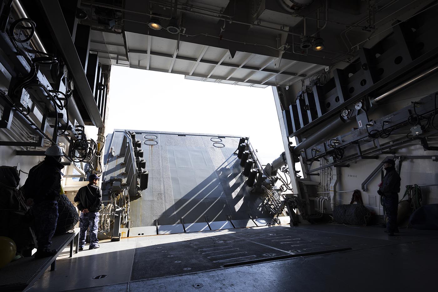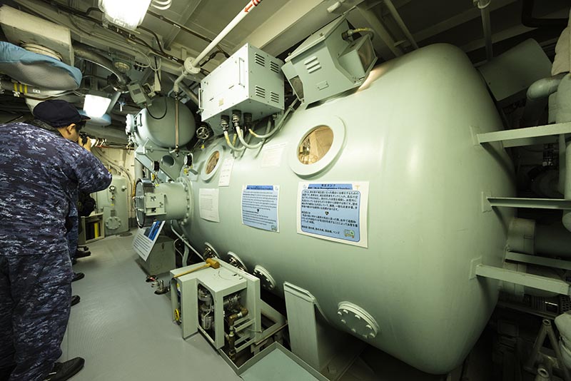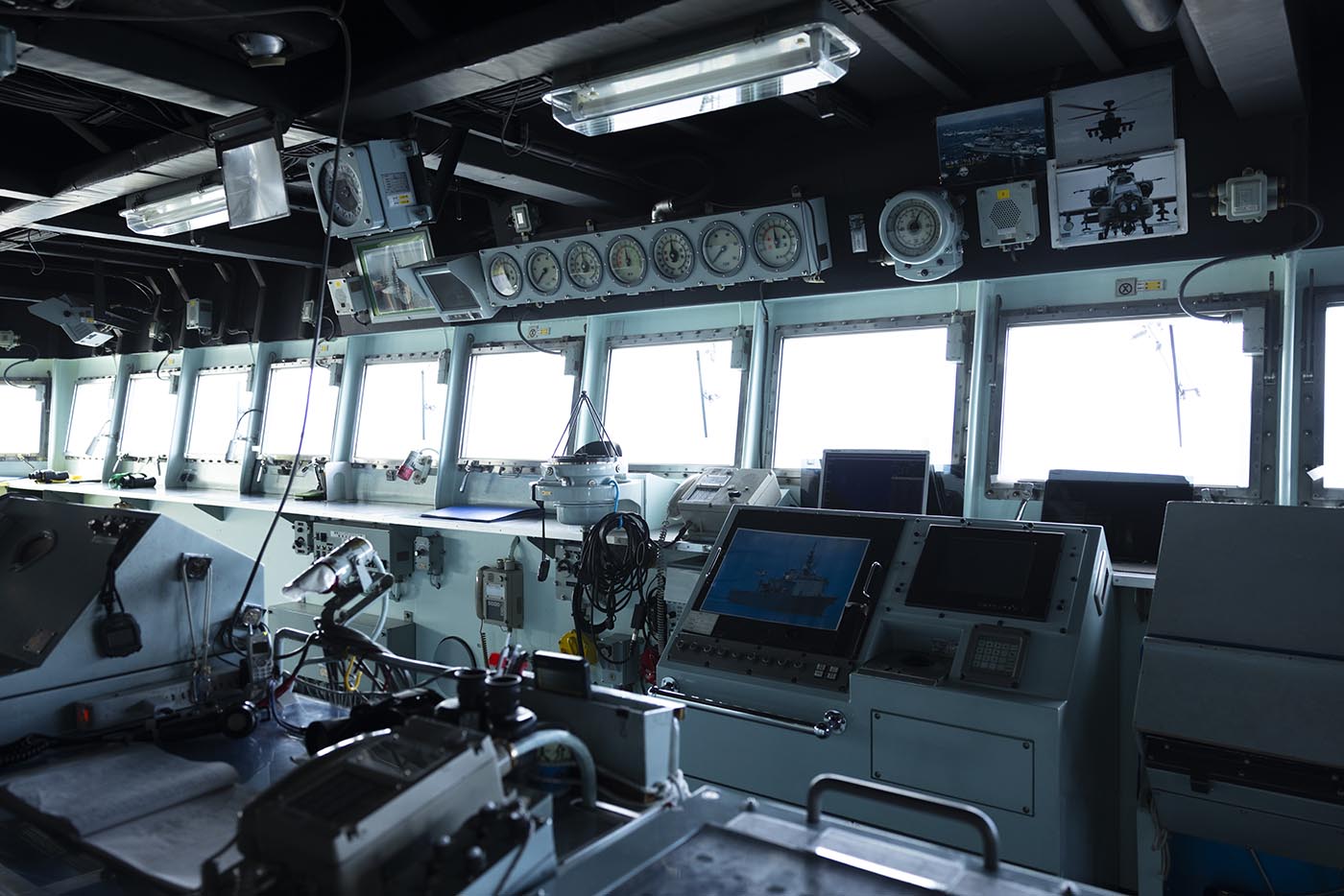 掃海母艦の機能としては、司令部の機能、燃料や食料の補給、機雷敷設機能、航空機支援機能がある。掃海艇には、多くの燃料や食料を積むことができないので、何日もかかる活動や訓練に出る時は、掃海母艦の出番となる。通常の乗組員は、100名強だが、今回の訓練では司令部としての人員が加わっているため、190人ほどが乗り組んでいる。なお、このような訓練がなければ、司令部の機能は陸上にある。それから、掃海母艦は、掃海艇に同行できるように喫水(水に浸かっている部分)が浅くなっているため、天気が悪いとよく揺れるそうだ。ひどい時には30度くらい傾くそうなので、そんな時に乗っていられる自信はない。海が穏やかな日でよかった。