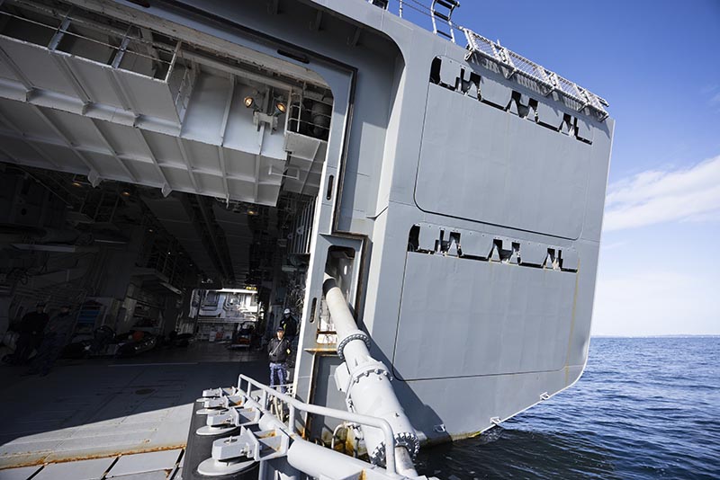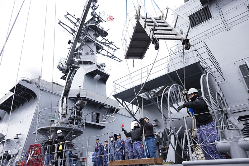 さて、そんなこんなを見せてもらっているうちに、掃海母艦「ぶんご」に移動する時間になっていた。掃海艇「たかしま」を「掃海母艦「ぶんご」に横付けして、海の上で乗り移る。「ぶんご」は、錨を下ろしている状態だったが、風や潮流によって、まるで蛇行するかのように左右に動いている。小さな掃海艇は、タイミングを見計らいつつ横付けしなければいけないので、かなり神経を使う作業だ。条件が悪ければ諦めなければいけないこともある。