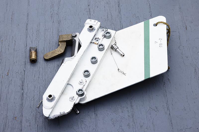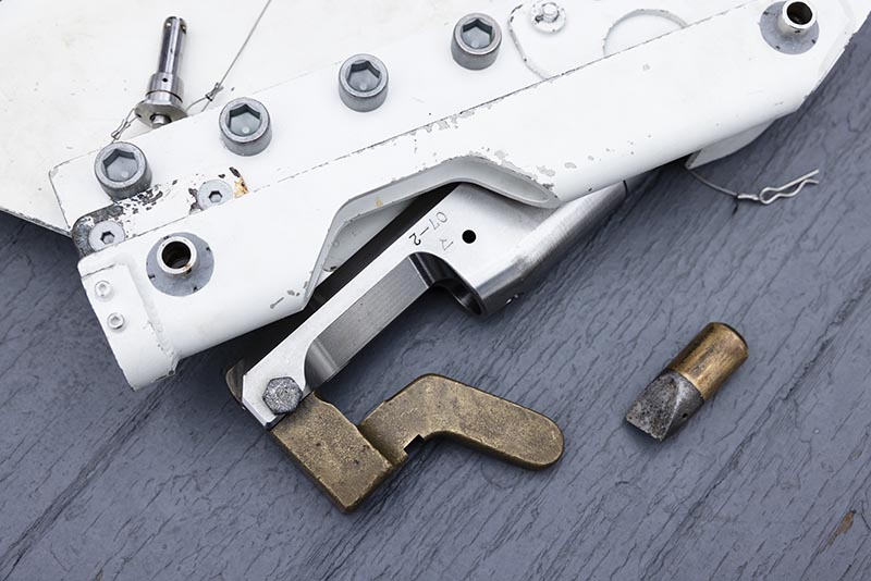 カッターが、機雷の係留ワイヤを切断する仕組みについて説明しよう。「く」の字形の真鍮製と思しき金具と白色の本体の間に機雷の係留ワイヤが滑り込む。そのワイヤに向けて火薬で押し出されたクサビが打ち込まれ、ワイヤが切断される。