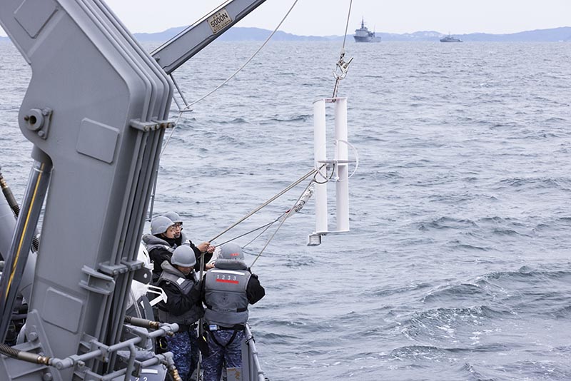 さて、肝心の訓練は、「令和7年度機雷戦訓練(伊勢湾)及び掃海特別訓練」という名称。参加艦艇14隻、参加人員は900人ほどで、900人の中には、アメリカ軍も10人ほど含まれる。現地での訓練期間は一週間ほどだが、準備や現地までの移動時間を含めると一ヶ月くらいかかる、かなり大規模な訓練だ。場所は、伊勢湾内の許可を得た区域、5.4×18キロメートルの範囲で行われた。国内でこのような訓練ができる場所は4ヶ所あり、それぞれの場所で年一回ずつ訓練が行われている。漁業関係者をはじめとした周辺の人たちの理解と協力が必要なので、あちこちでできる訓練ではない。