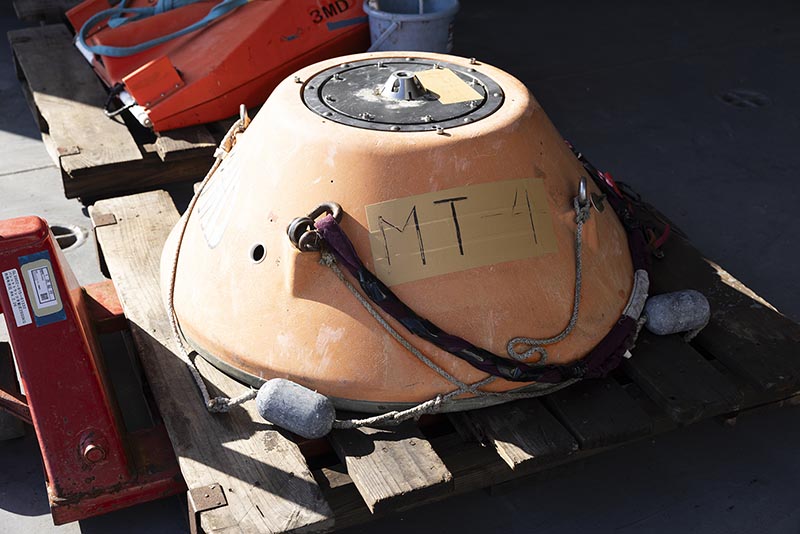 今回の訓練展示では、機雷の係留ワイヤを切断する作業の一部を見せてもらった。本当はフロートを下ろした後、カッターの付いたケーブルを伸ばして機雷の係留ワイヤを切るのだけど、作業に2時間くらいかかるので、今回はフロートを下ろして引き上げる作業の見学だった。ちょっと残念。なお、フロートには、カッターのついたケーブルを左右に広げるための装置と深度を決めるための装置がぶら下がっている。