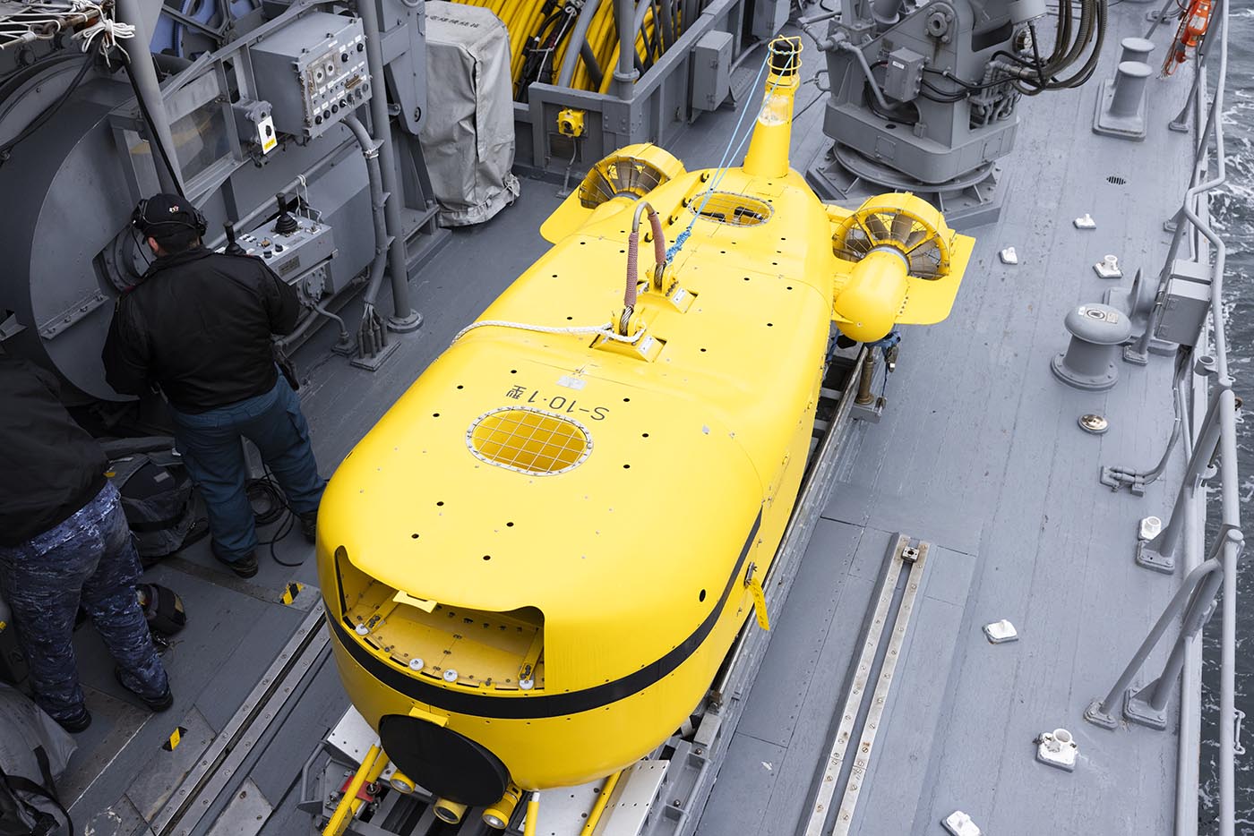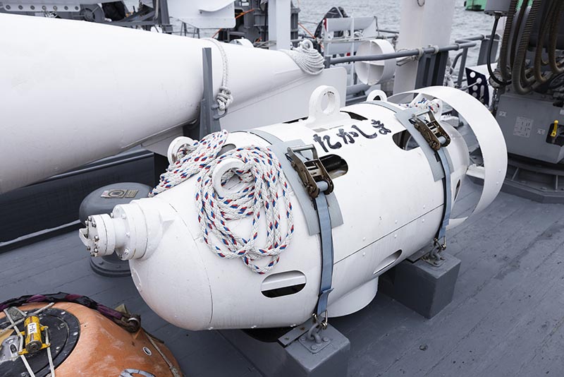 水中航走式機雷掃討具S-10についてもう少し詳しく説明しておこう。電源は船からケーブルで供給しているので、パワーがあって海流にも流されない。また、長時間駆動できる。船体下部の両側には、爆薬を搭載できる。先端にはカメラとライトがついており、ワイヤカッターを取り付けることもできる。ただし、最近は、ライトの光に反応する機雷もあるので、自走式機雷処分用弾薬(EMD)に切り替わりつつある。