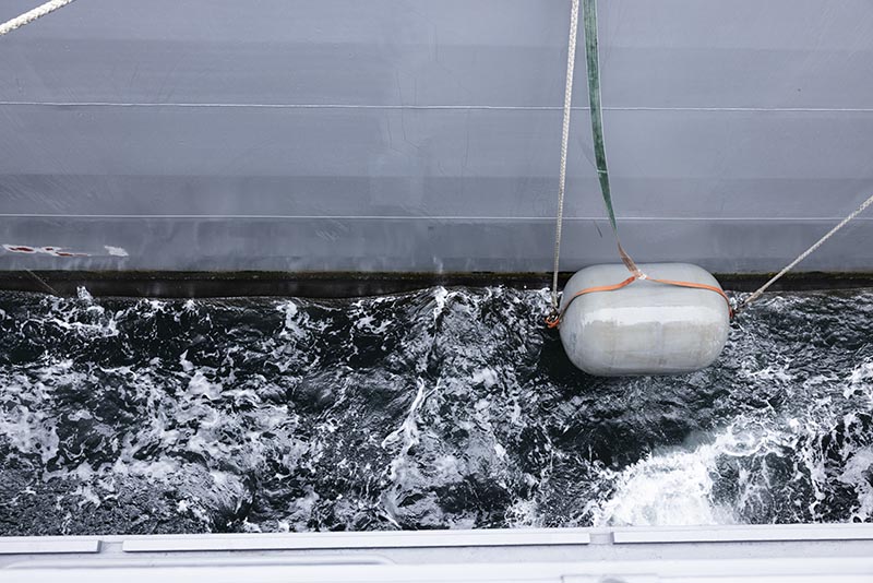 港を出てしばらくしてから後ろを振り返ったら、何やらボートが追いかけてくる。松坂港で、もやいロープを解いていた隊員が追いかけてきたのだった。松坂港は民間の港なので、陸上での作業は自分たちで行わなければいけないのだ。