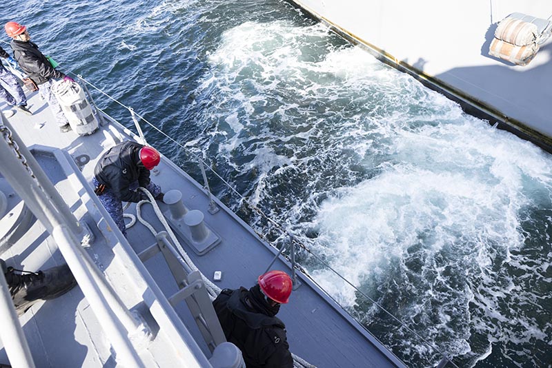 「ぶんご」の見学が終わって「たかしま」に戻ってきた。船を離す時は、掃海艇の船尾を少し離した後、船首にあるスラスターを使って本格的に離してゆく。相手に不安を抱かせないような離れ方をするように心がけているとのこと。